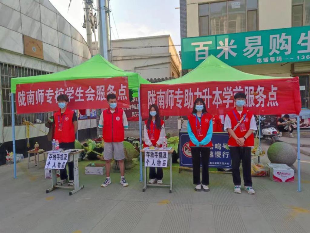 为了进一步方便我校专升本考试,校学生会和学院志愿者服务队的同学在专升本考试当天开展了暖心助力志愿服务活动,志愿者在一中和成州中学考点为我校考生提供了爱心服务。