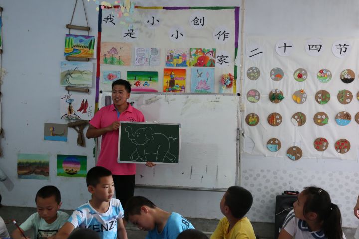 图为志愿者老师教孩子们画大象。中国青年网通讯员 杜金波 摄