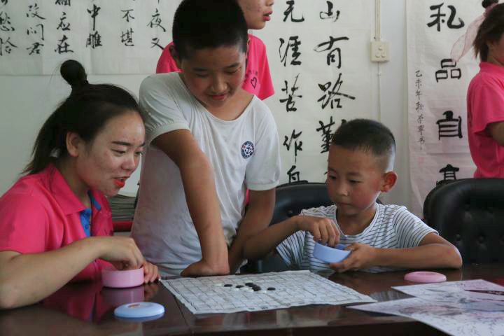 图为实践队队员和小朋友们在课间进行游戏互动,陪他们下五子棋,丰富他们的课余生活。中国青年网通讯员 杜金波 摄