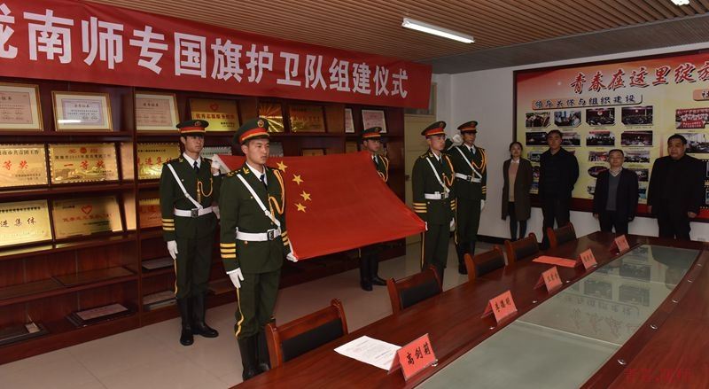 组建仪式上,陇南师专团委副书记高剑莉宣读了《关于组建学校国旗护卫队的决定》,王录全同志代表学校向国旗护卫队授了队旗,全体队员面向国旗进行了宣誓。