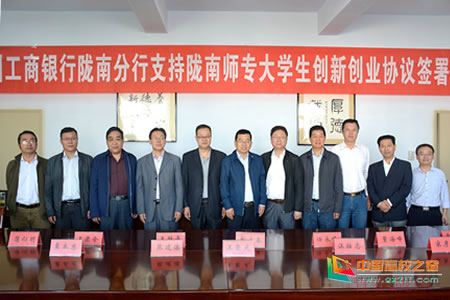 9月28日上午,陇南师范高等专科学校举行了中国工商银行陇南分行支持陇南师范高等专科学校大学生创新创业协议签署仪式。中国工商银行陇南分行副行长王聚龙,中国工商银行成县支行行长张建德,副行长汪壮志、粟本忠,陇南师范高等专科学校校长刘先春,副校长任永峰,党委委员王录全等领导出席签字仪式,学校教务处、择业指导处、财务处、团委等部门负责人参加了本次活动。副校长王胜青主持签约仪式。