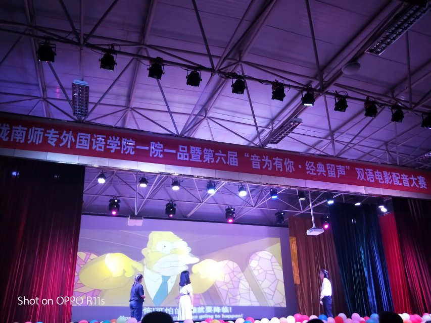比赛在活力四射的开场舞中拉开了帷幕。本次比赛共分为中文组和英文组两组,比赛过程中先展示原声作品,再播放消音作品由选手配音。首先进行是英文组,参赛队伍所选取的配音材料题材丰富,既有置身于魔法世界的《哈利波特》,也有歌颂爱情的《泰坦尼克号》,还有长不大的《小黄人》,其中配音作品《寻梦环游记》以真挚的情感,生动的画面唤起了观众对家人的思念。英文组配音结束后,王莉娟同学为大家带来了优美的歌曲《知否,知否》。为庆祝新中国成立70周年暨五四运动100周年,外国语学院在本次配音中特别增加了经典红色 电影片段配音,以此传承红色基因,继承革命传统,将爱国情怀传承。其中第四组选手对《建国大业》经典影视名作惟妙惟肖的创意配音,更是赢得了评委与观众的一致好评。台下同学对选手们支持的呐喊声响彻全场。每组选手都尽心尽力融入剧情,他们的配音对人物的情绪把握恰如其分,语言模仿称得上惟妙惟肖。观众们在欣赏到精彩电影的同时,也享受了一场视觉与听觉上的饕餮盛宴。到此,比赛也接近了尾声,外教Sam和学生处处长李晓江为此次比赛做了精彩点评。