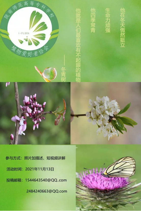 “我和校园植物合影”活动为线上比赛,分享身边植物并对植物形态所知情况进行描述,描述以文字、照片或拍成短视频等多种形式投稿至植物爱好者协会邮箱,我们会将优秀作品制成短视频发布到社团公众号。
